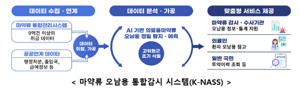 식약처는 올해 마약류통합관리시스템의 마약류 취급 데이터와 관계기관 정보*를 연계 분석해 의료용 마약류 오남용과 불법유통을 신속 정밀하게 탐지하고 사전 예측할 수 있는 ‘마약류 오남용 통합감시시스템(K-NASS)’ 구축**을 완료한다는 계획이다.