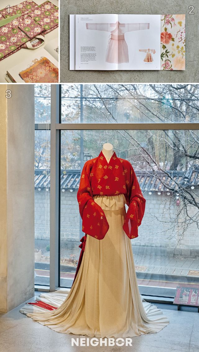 1 국립대구박물관이 소장한 고려 금직물을 토대로 재현한 저고리. 2 2000년 한국 복식사를 망라한 서적 <자연을 여미다>. 3 온지음 옷공방이 개발한 라 직물로 제작한 고려 불상화 속 여성 복식.