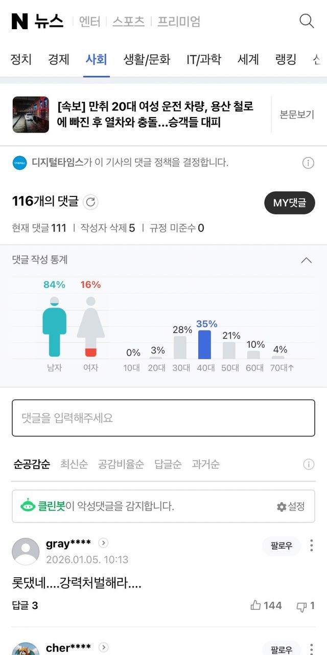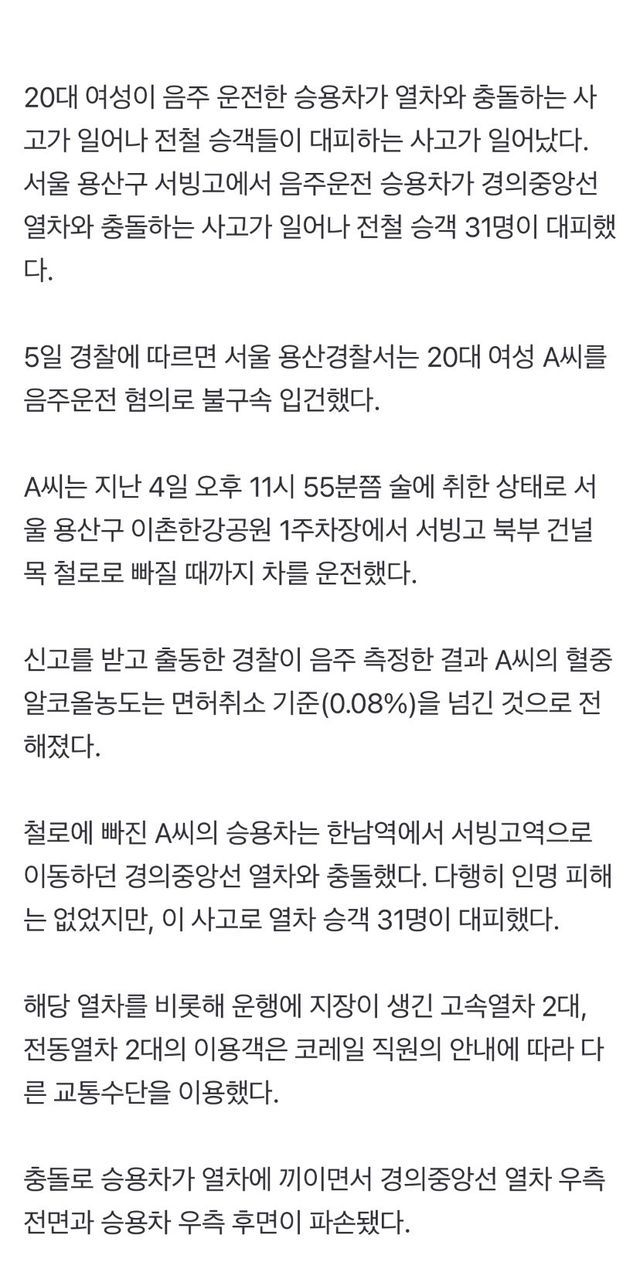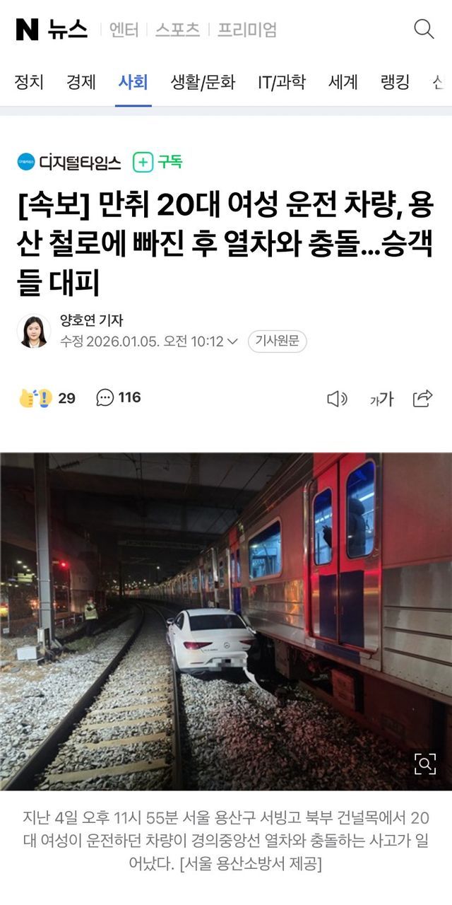 만취 20대 여성 운전 차량, 용산 철로에 빠진 후 열차와 충돌