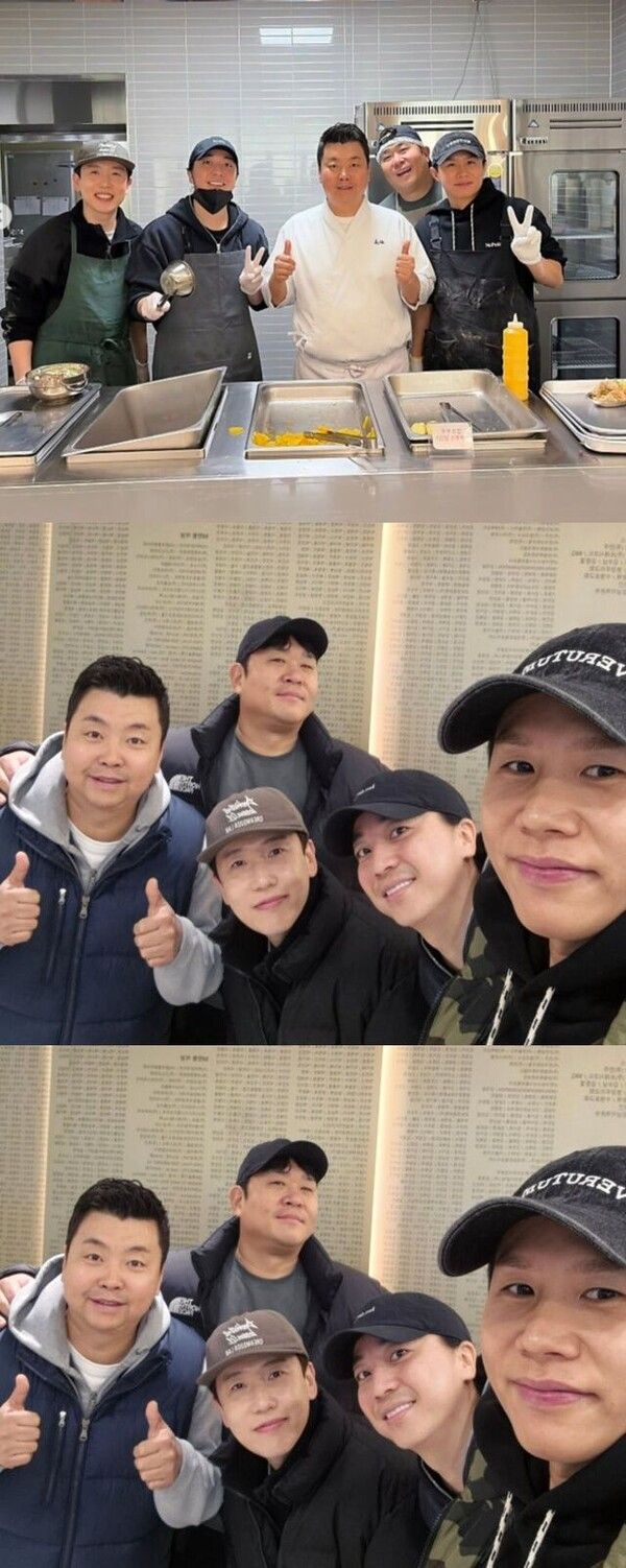사진 속 정호영은 요양병원 앞과 조리실에서 양세형, 문세윤, 넉살, 남창희 등과 함께 포즈를 취하고 있다.