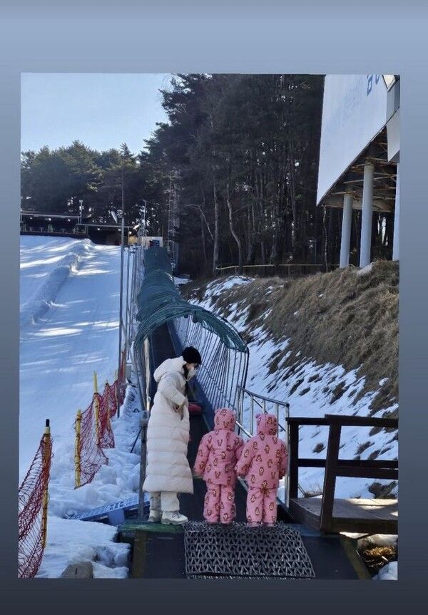공개된 사진 속 성유리는 눈썰매장으로 보이는 곳에서 쌍둥이 딸과 함께 서 있다.