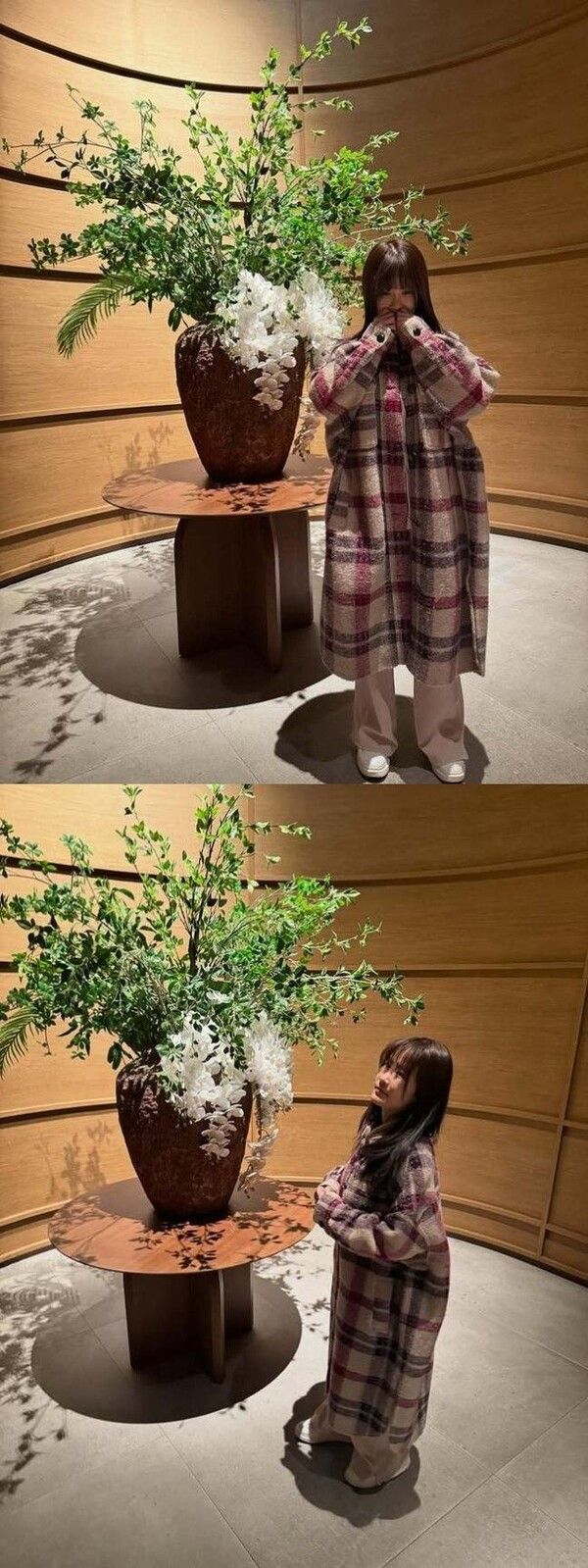 김지민은 실내 공간에서 체크무늬 코트를 입고 꽃 장식 앞에 서 포즈를 취하고 있다.