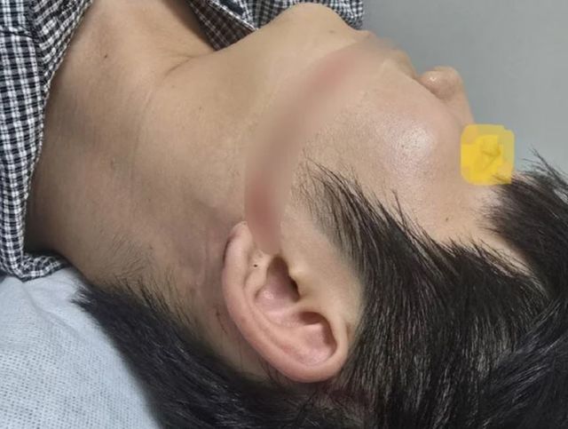 지난해 경기 안산에서 발생한 ‘고압 워터건 사고’로 A씨가 얼굴에 찰과상을 입은 모습 / 연합뉴스