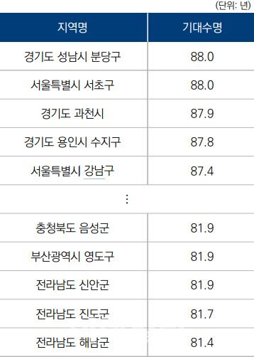 시·군·구 중 기대수명이 가장 긴 지역은 경기도 성남 분당과 서울 서초였다. 88.0년으로 전국에서 건강하고 오래 살 것으로 기대되는 이들이 가장 많았다. 그 뒤를 △경기 과천(87.9년) △경기 용인 수지(87.8년) △서울 강남(87.4년) 등이 이었다.
