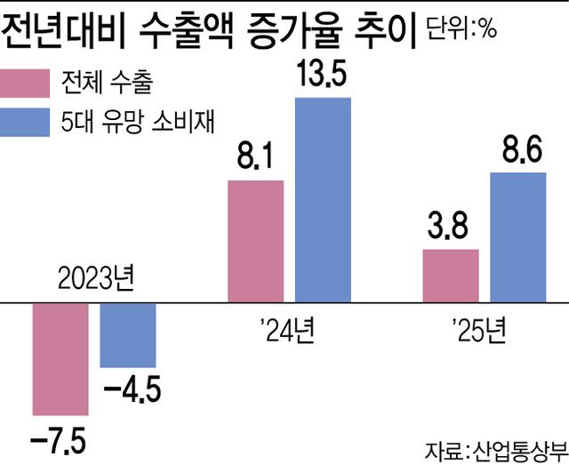한류 열풍에 힘입어 K수출 품목을 다변화해, 반도체에 치우친 수출 구조를 개선해야 한다는 목소리도 나온다. 산업통상부에 따르면 지난해 5대 유망소비재(농수산식품·화장품·패션의류·생활용품·의약품) 수출액은 464억달러(약 67조원)로 전년대비 8.5% 증가했다.