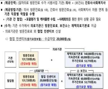 협업형의 경우 의료기관에는 방문진료료(건강보험 재정)와 협업 인센티브 2만원(인당/월, 장기요양 재정)를, 보건소에는 재택의료기본료, 지속관리료, 추가간호료(장기요양 재정)를 각각 지급한다.
