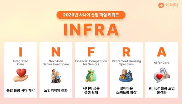 인구고령화로 시니어산업이 성장세를 이어가고 있는 가운데 케어닥이 올해 국내 시니어산업의 흐름을 예견하는 핵심 키워드로 ‘인프라(I.N.F.R.A)’를 선정했다고 밝혔다.