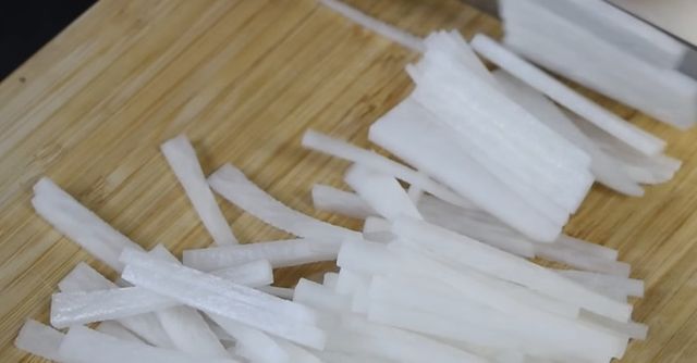 콩나물을 건져낸 그 물이 바로 국물의 기반이 된다. 여기에 채썬 무를 넣고 한소끔 끓여 무의 단맛을 우려낸다. 다시마 육수를 더해 감칠맛을 보완하면 국물의 뼈대가 완성된다. 다시마는 오래 끓이지 않는다. 끓기 시작한 뒤 짧은 시간만 사용해야 쓴맛이 나지 않는다.