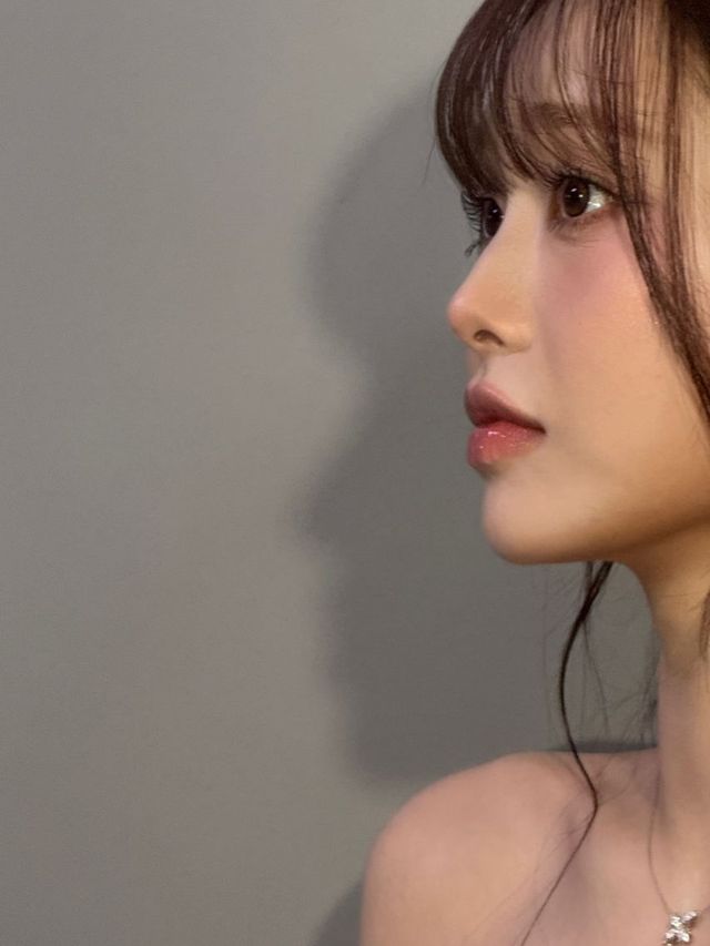 뷰티 연출은 츄의 입체적인 이목구비를 부드럽게 강조하는 데 집중했습니다. 눈가와 뺨을 물들인 은은한 핑크빛 음영 메이크업은 고혹적이면서도 생기 있는 분위기를 자아내며, 촉촉한 텍스처의 립은 전체적인 룩에 맑은 이미지를 더합니다. 이마 라인을 가볍게 덮은 시스루 뱅과 높게 묶어 올린 반묶음 헤어는 그녀의 작은 페이스 라인을 돋보이게 하며, 어깨 뒤로 흐르는 롱 웨이브는 여신 같은 우아함을 완성합니다.