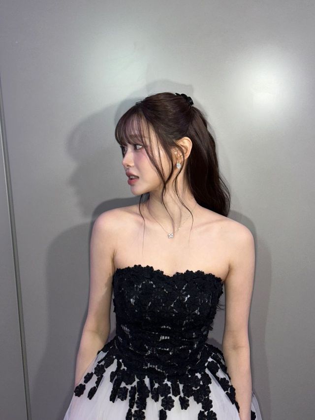 츄가 선택한 메인 의상은 상반신 전체를 촘촘하게 수놓은 블랙 플라워 아플리케가 인상적인 오프숄더 드레스입니다. 가슴 라인을 따라 입체적으로 피어난 꽃 장식은 우아한 볼륨감을 선사하며, 시스루 질감의 화이트 튤(Tulle) 스커트 위에 흩뿌려진 검은 꽃잎들은 마치 밤하늘의 꽃밭을 연상시키는 환상적인 대비를 이룹니다.