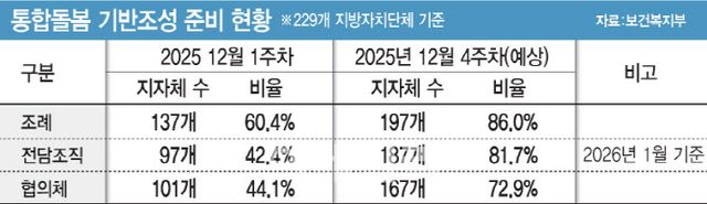 복지부에 따르면 지난해 12월 1주차 기준 통합돌봄 관련 인력을 배치한 지자체는 165개(72.1%)로 비교적 높은 수준이었지만 증가세가 뚜렷하지 않다. 복지부 측은 “지자체가 신규 인력 채용과 기존 인력 재배치를 병행해야 하는 구조여서 일정부분 시간이 필요하다”고 설명했다.