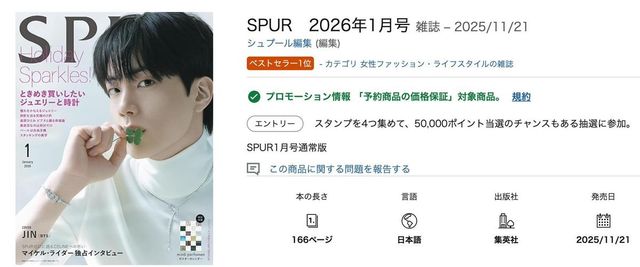 방탄소년단(BTS) 진이 일본 패션 매거진 SPUR 표지 모델로 나서며 아마존 재팬 베스트 셀러 1위를 차지했다. SPUR 2026년 1월호는 판매 개시와 동시에 아마존 재팬 종합 베스트 셀러 정상에 올랐고, 국내에서는 교보문고에서 품절되며 높은 관심을 입증했다.