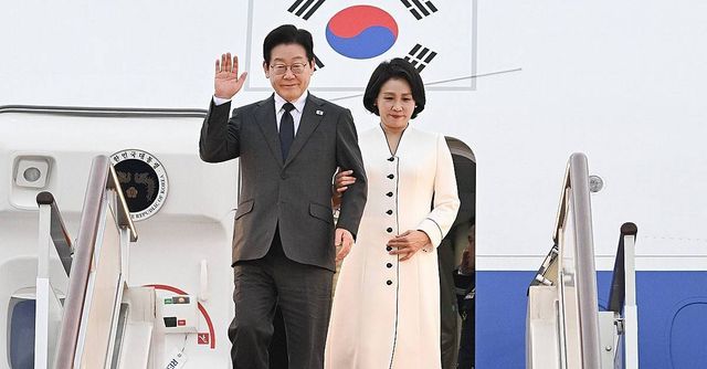 중국을 국빈방문 중인 이재명 대통령과 김혜경 여사가 지난 6일 상하이 푸동 공항에 도착한 공군 1호기에서 내리며 환영객에게 인사하고 있다 / 연합뉴스
