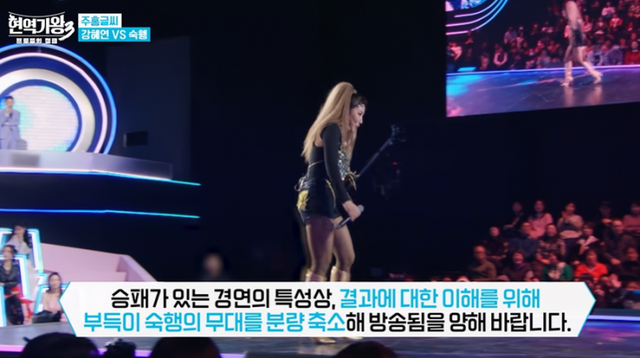 가수를 소개하는 장면에서 숙행이 대기석에서 무대로 이동하는 장면이 그려졌고, ‘승패가 있는 경연 특성상 결과에 대한 이해를 위해 부득이 숙행의 무대를 분량 축소해 방송됨을 양해 바란다’는 자막이 삽입됐다. 이후 숙행이 강혜연과 대결에서 이겼다는 설명이 더해졌다.