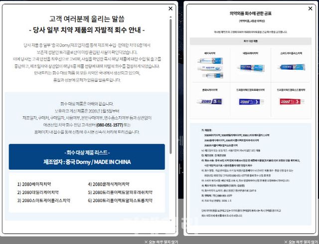 회수 대상은 ‘2080 베이직치약’, ‘2080 데일리케어치약’, ‘2080 스마트케어플러스치약’, ‘2080 클래식케어치약’, ‘2080 트리플이펙트 알파 후레쉬치약’, ‘2080 트리플이펙트 알파 스트롱치약’ 등 6종이다. 해당 제품은 중국 도미(Domy)가 제조하고 애경산업이 수입·판매해 왔다.