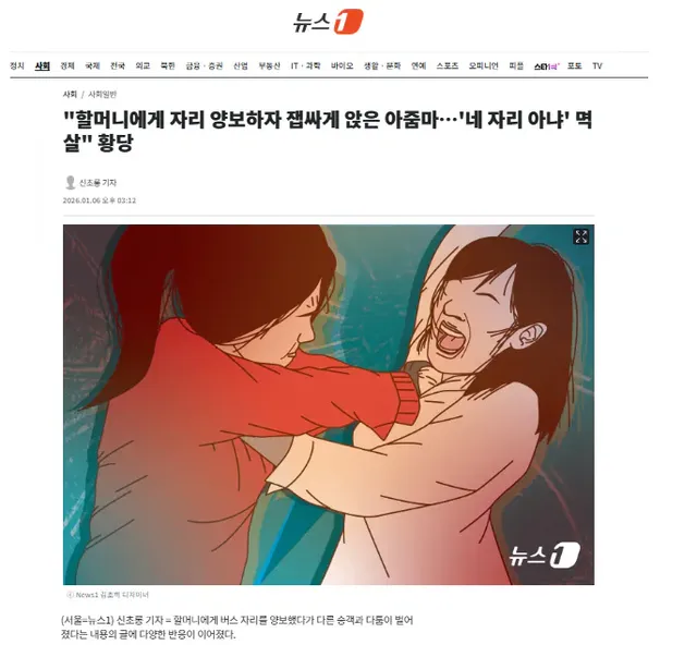할머니는 "미안하다. 두 정거장 뒤에 내리니 그냥 앉아서 가라"라고 말했다.