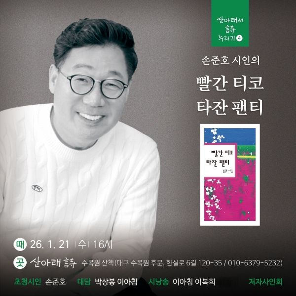 이번 북토크는 손준호 시인의 세 번째 시집 ‘빨간 티코 타잔 팬티’ 출간에 이어 최근 무안문학상과 안동문화상을 연이어 수상한 쾌거를 함께 축하하는 특별한 자리로 마련된다. 당선 작품을 중심으로 독자들과 생생한 대화를 나누며, 시인의 개성적인 문장 세계와 시집이 탄생하게 된 배경 등을 깊이 있게 들여다보는 시간이 될 예정이다. 더불어 신춘문예 당선 비결과 문학공모전 당선 과정의 실제 경험, 시창작 방법론까지 직접 듣고 나눌 수 있는 흔치 않은 기회로, 시와 문학을 사랑하는 독자들에게 의미 있는 시간이 될 것으로 기대된다.