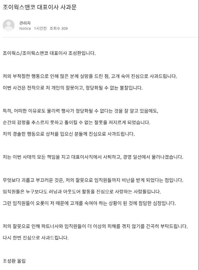 조씨는 7일 조이웍스앤코 누리집에 ‘대표이사 사과문’을 올리고 “저의 부적절한 행동으로 인해 많은 분께 실망을 드린 점, 고개 숙여 진심으로 사과드린다. 이번 사건은 전적으로 저 개인의 잘못이고 정당화될 수 없는 불찰”이라며 이같이 밝혔다.
