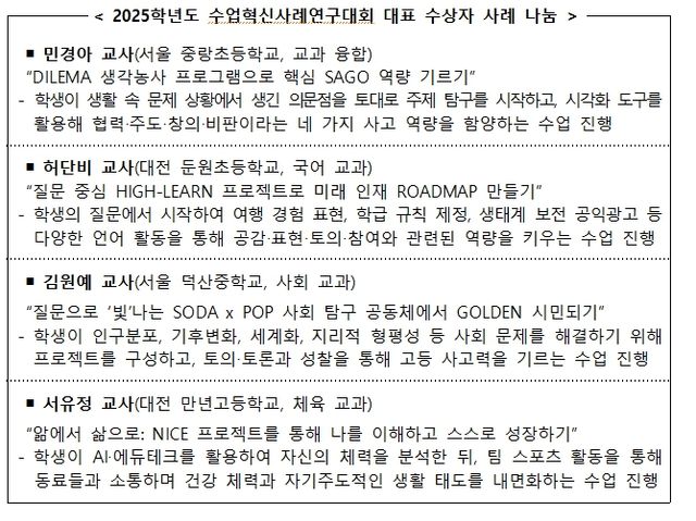[파이낸셜경제=김영란 기자] 교육부와 한국교육과정평가원(원장 직무대리 박은아)은 1월 7일, 엘타워(서울)에서 수상자와 교육청 관계자 등이 참석한 가운데 ‘2025학년도 수업혁신사례연구대회 시상식’을 개최한다.