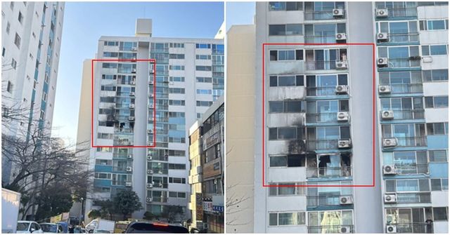 사진 속 8층 발화 세대는 발코니 유리창이 깨져 내부가 그대로 노출됐고 발코니 안쪽과 외벽, 창틀 전반이 불에 타 검게 그을린 흔적이 뚜렷하다.