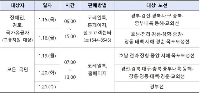 예매는 교통약자 사전 예매와 전 국민 일반 예매로 나뉜다. 교통약자 사전 예매는 1월 15일, 16일 이틀간 오전 9시부터 오후 3시까지 진행되며 대상은 65세 이상 고령자, 등록 장애인, 국가유공자 중 교통지원 대상자다.