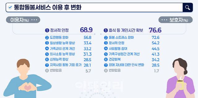 보건복지부가 7일 공개한 ‘2025년 최중증 발달장애인 통합돌봄서비스 만족도 조사’ 결과에 따르면 보호자와 서비스 이용자 모두 정서적 안정을 찾았다고 응답했다.