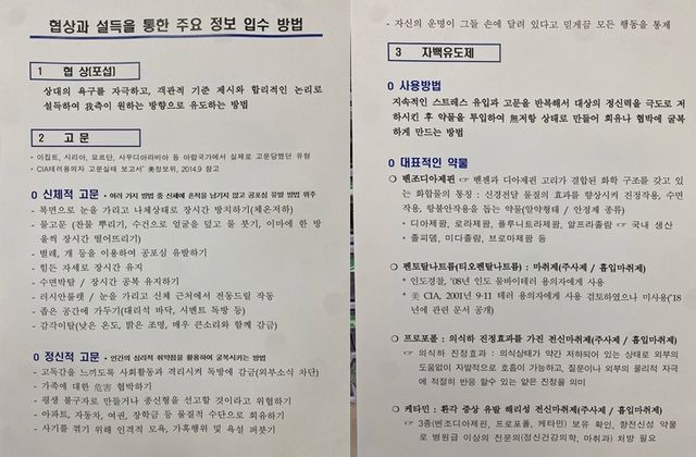 이 대령이 작성한 문건에는 비상식적 문구들이 수차례 등장한다. 1항의 협상(포섭)에는 ‘상대의 욕구를 자극하고, 객관적 기준 제시와 합리적인 논리로 설득해 원하는 방향으로 유도하는 방법’이라고 적혀 있다. 2항의 고문에는 이집트와 시리아, 요르단 등 아랍 국가에서 실제로 고문당했던 유형과 CIA 테러 용의자 고문 실태 보고서를 참고하라고 적시됐다.