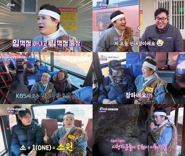 6일 방송된 KBS 1TV ‘6시 내고향’에서는 경북 영천시 버스에 올라 이웃들의 인생사를 만나는 ‘국민 안내양’ 김정연의 모습이 그려졌다. 앞서 거제시 편에서 명소 찾기에 실패했던 김정연은 이날 임꺽정 분장을 하고 등장해 시작부터 시선을 강탈했다. 입 전체를 덮는 수염 분장과 가죽옷 차림에 버스 기사조차 놀라 뒷걸음질을 치는 해프닝이 벌어졌다.