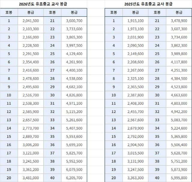 인사혁신처의 ‘2025·2026년 유·초·중·고 교원 봉급표’에 따르면 저연차로 분류되는 9호봉 기준 교사 봉급은 작년 월 236만5500원에서 올해 249만5600원으로 5.5%(13만100원) 인상된다. 8호봉은 같은 기간 232만5100원에서 247만8600원으로 6.6%(15만3500원) 오른다. 10호봉과 11호봉 인상률도 5.4%가 적용된다.