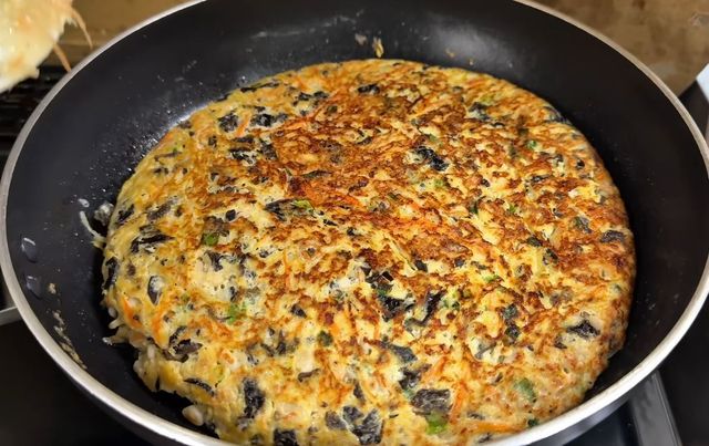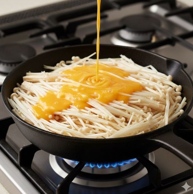 이 요리가 특별한 이유는 팽이버섯의 구조에 있다. 팽이버섯은 수분이 많고 가늘게 뻗은 형태라 서로 엉키기 쉽다. 여기에 계란물이 더해지면, 계란 단백질이 열을 받으며 팽이버섯 사이를 자연스럽게 연결해준다. 밀가루 반죽처럼 무겁게 덮는 방식이 아니라, 재료끼리 붙잡아주는 역할을 하는 셈이다. 그래서 부쳤을 때 흐트러지지 않고, 뒤집어도 잘 부서지지 않는다.