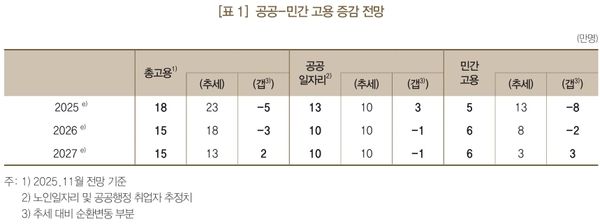 공공일자리는 증가규모가 10만 명 수준으로 지난해(13만 명)보다 축소되고 내년까지 비슷한 증가규모를 유지할 전망이다. 이에 올해 총고용(15만명)은 노동공급 증가세 감소, 공공부문 축소 등으로 지난해(18만 명)보다 증가규모가 다소 축소될 것으로 예상된다.