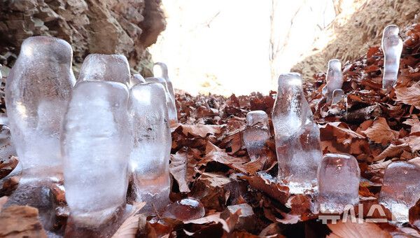 [서울=뉴시스] 7일 오전 인천 부평구 산곡동의 한 토굴 바닥에서 시작해 위로 올라가는 '역고드름'이 자라고 있다.