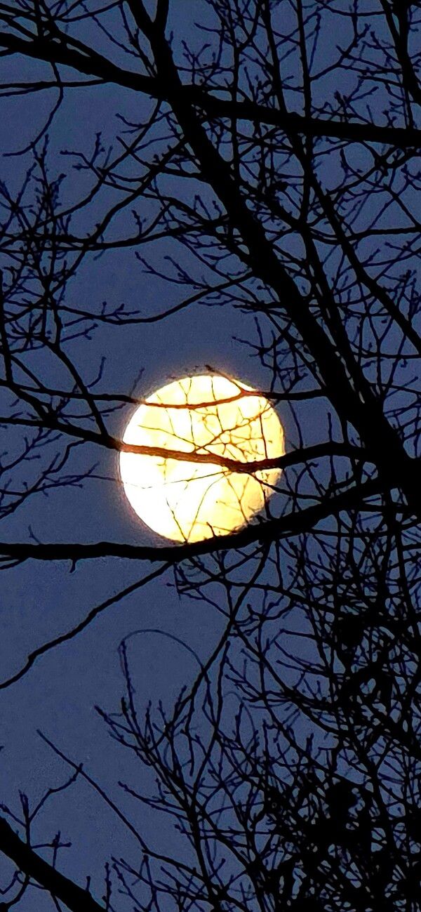 새벽의 공기가 가장 투명해지는 시간, 동그란 보름달이 뒷산의 겨울나무 가지 사이에 살포시 걸려 있습니다.