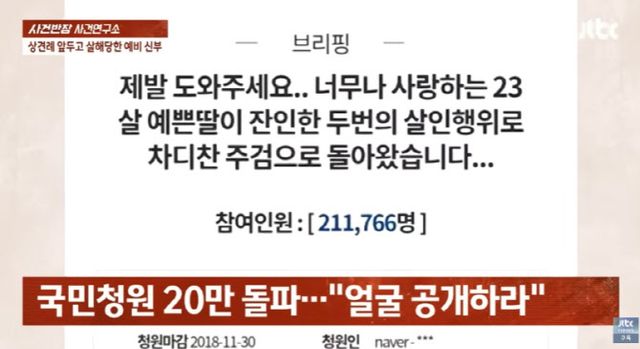B씨의 유족은 청와대 국민청원 게시판에 범인의 신상을 공개해달라는 청원을 올렸고, 청원 마감일까지 한 달 동안 21만여 건이 넘는 동의를 얻었다. 유족은 “엽기적인 살인마의 범행을 어떻게 사람이 할 짓이라 할 수 있겠습니까? 이런 중대한 범죄에 대해 살인 피의자의 얼굴 등 신상을 공개한다면 저 같이 피눈물 흘리는 엄마가 나오는 것을 예방할 수 있을 것”이라고 호소했다.