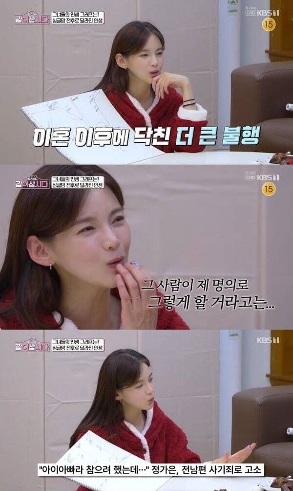 뉴시스 보도에 따르면, 정가은은 7일 첫 방송한 KBS 1TV '황신혜의 같이 삽시다'에서 인생 그래프로 삶을 돌아봤다. "서른 아홉 살에 딸을 낳았을 때 가장 행복했는데, 1년 만에 갑자기 훅 떨어진다. 이혼을 선택했다"면서 "이혼도 힘들었지만 1~2년 후 더 안 좋은 일이 있었다. 그 사람(전 남편)이 내 명의로 그렇게 할 거라고 상상도 못 했다. 이혼 후 알게 됐고, 급하게 고소했다"며 울먹였다.