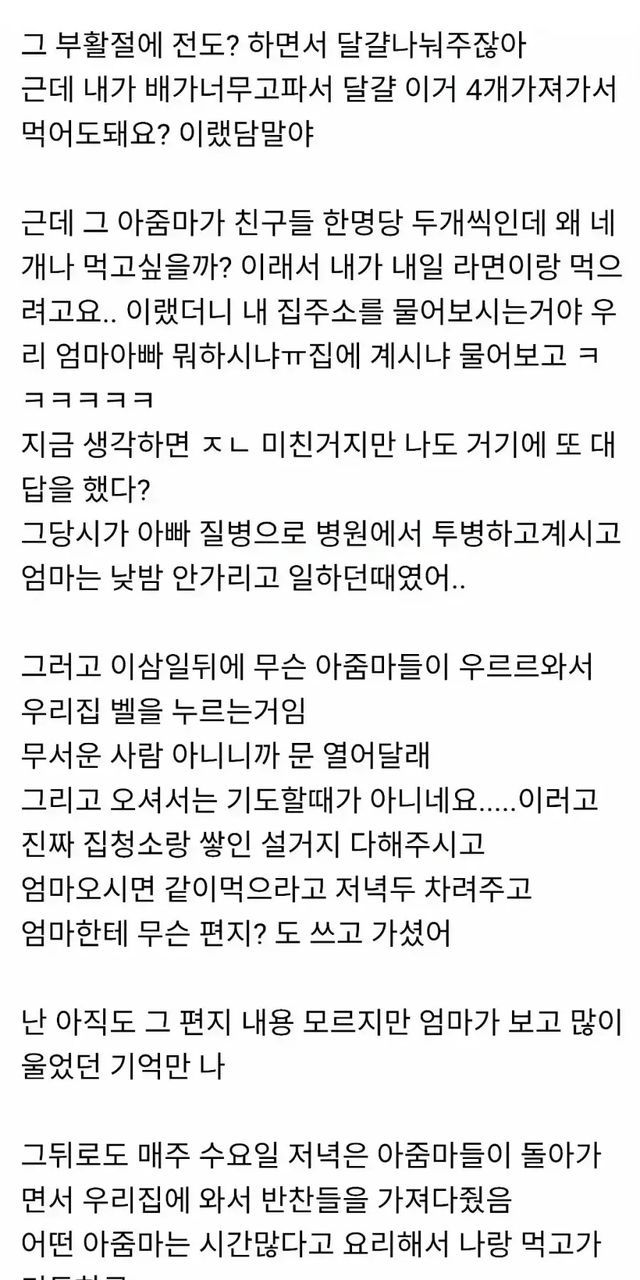 공개된 사진에는 과거 자신이 겪었던 따뜻한 일화를 상세히 기록한 게시글의 본문 내용이 담겨 있다. 작성자는 어린 시절 가정 형편이 어려웠을 때 부활절 달걀을 계기로 알게 된 이웃들이 집안일을 도와주고 반찬을 챙겨주었던 경험을 회상했다.