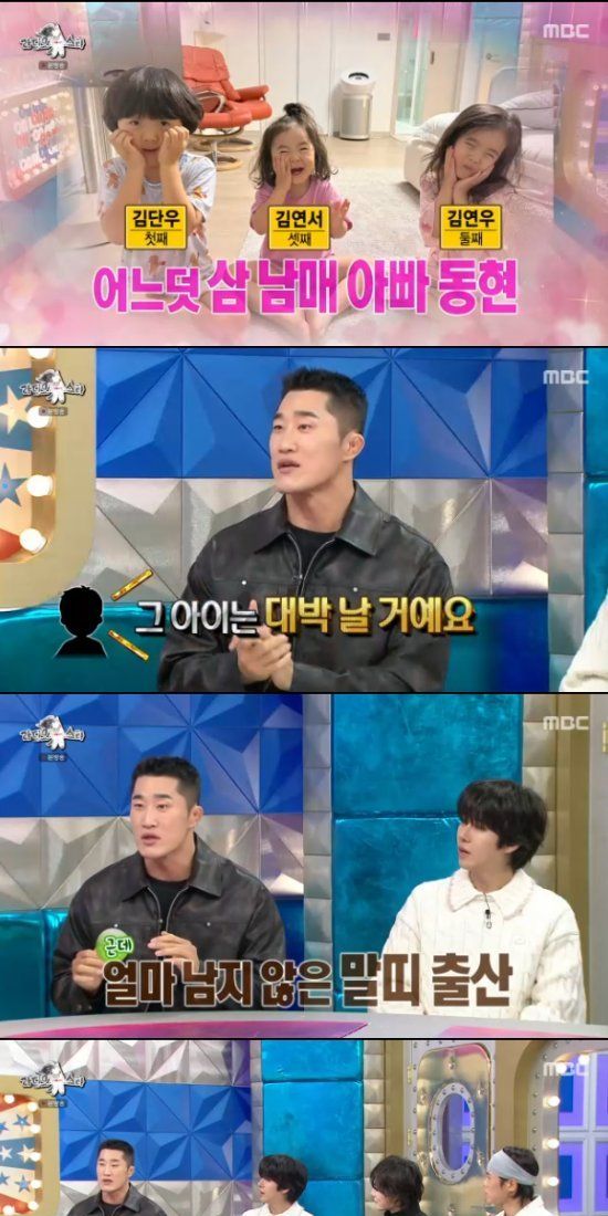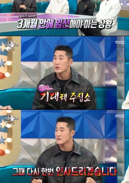 김동현은 "태어날 아기가 말띠가 되려면 이제 3개월 남았다. 아내도 '힘들지만 네 명이 있으면 너무 좋을 것 같다'고 자꾸 얘기를 한다. 션 형님도 같은 얘기를 했다"면서 "기대해달라. 힘 써보겠다. 그때 다시 한 번 인사 드리겠다"고 의지(?)를 다졌다.