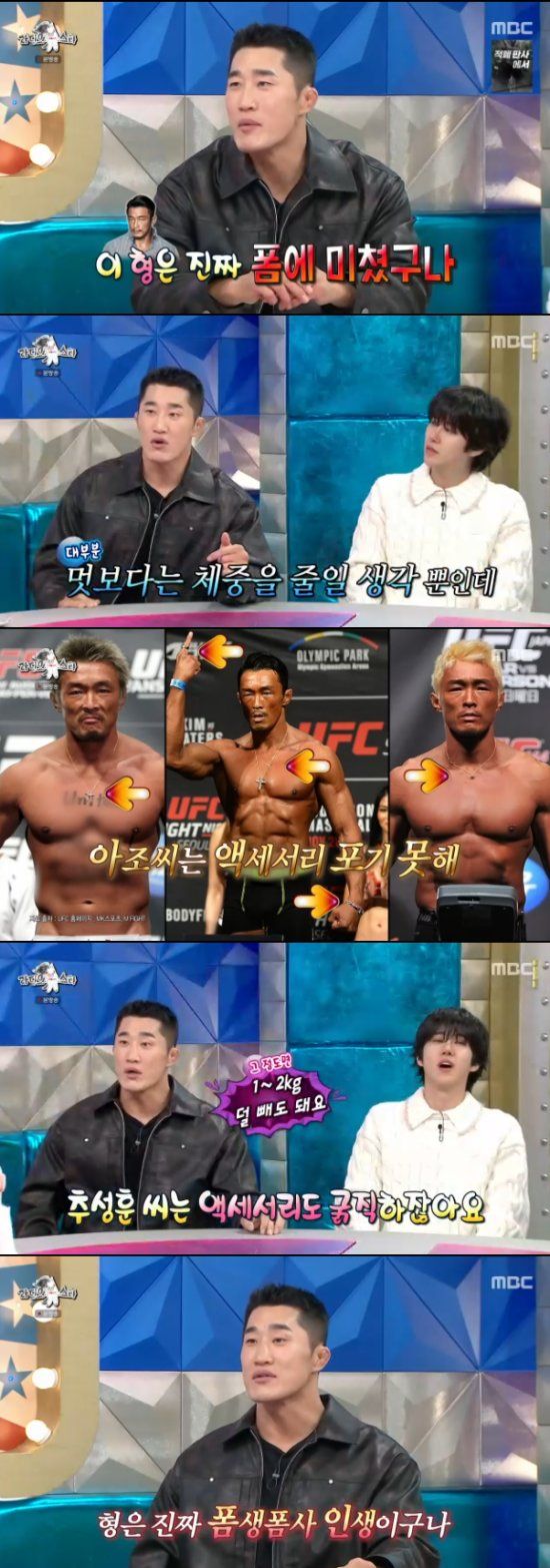 그러면서 "때문에 많은 선수들이 멋보다는 체중을 줄이는데 집중해서 정말 얇은 팬티 한 장만 입고 계체를 한다. 그런데 성훈이 형은 멋을 포기할 수 없어서 액세서리까지 한다. 액세서리를 하기 위해서 사우나를 한 번 더 하는거다. 그런 걸 보면 진짜 폼생폼사라는 생각이 든다"고 말해 눈길을 끌었다.