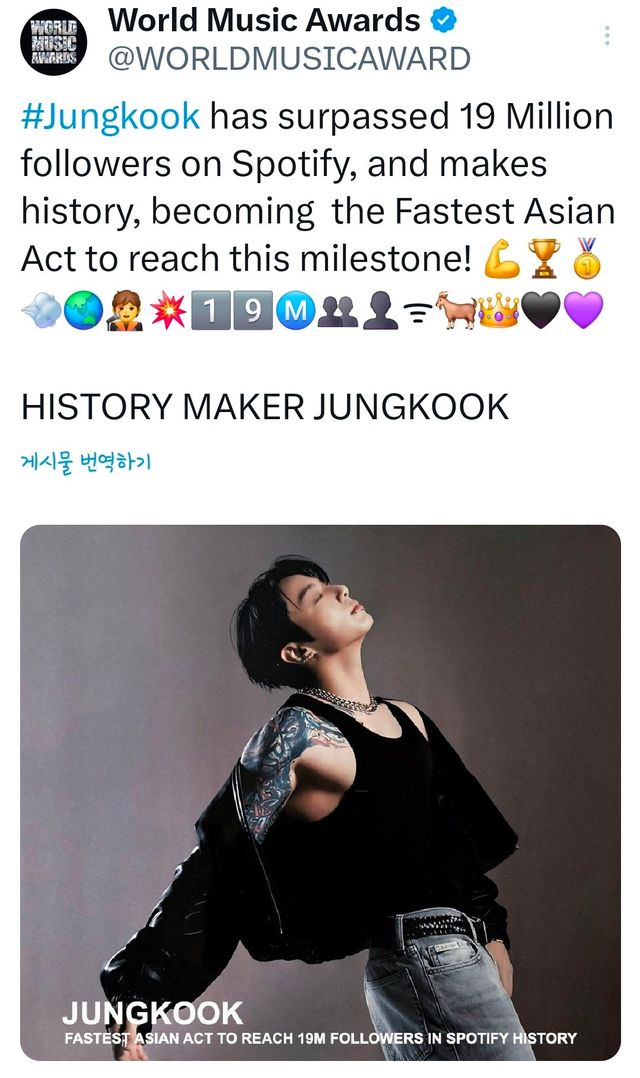 방탄소년단(BTS) 정국이 세계 최대 음원 플랫폼 스포티파이에서 또 하나의 이정표를 세웠다. 유럽의 빌보드로 불리는 월드뮤직어워드(WMA) 공식 계정에 따르면 정국은 개인 프로필 팔로워 수 1900만 명을 돌파했다. 아시아 아티스트 전체를 통틀어 가장 빠른 속도다. WMA는 이를 두고 ‘역사적인 기록’이라고 직접 언급했다.