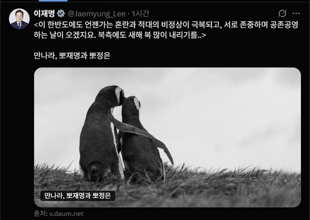 또 이 대통령은 ‘만나라, 뽀재명과 뽀정은’이라는 제목의 기고 글도 함께 소개했다. 남북 합작 애니메이션 ‘뽀롱뽀롱 뽀로로’를 소재로, 이 대통령과 김정은 북한 국무위원장의 만남이 이뤄지길 바라는 내용을 담았다.