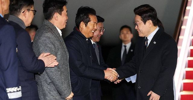 중국 국빈방문 일정을 마치고 귀국한 이재명 대통령이 지난 7일 성남 서울공항에서 환영나온 더불어민주당 정청래 대표와 인사하고 있다 / 연합뉴스