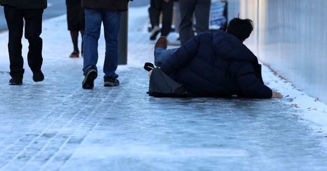 한 시민이 빙판길에 미끄러져 넘어지고 있다. / 뉴스1
