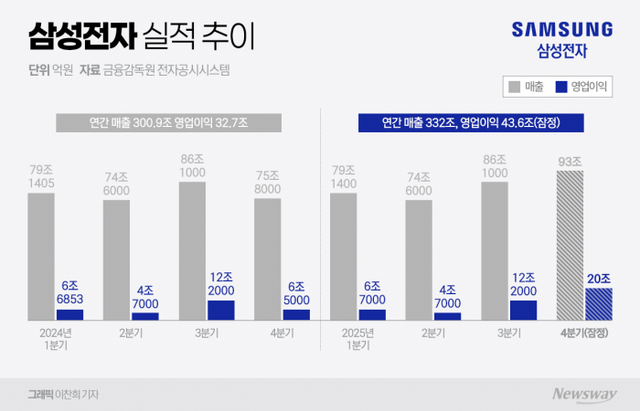정민규 상상인증권 연구원은 "HBM3E 물량 확대와 HBM4 양산 개시가 예상되며, 파운드리 가동률 및 수율 상승과 함께 DS 주도의 실적 개선이 기대된다"며 "2026년 1분기 매출액과 영업이익은 각각 93조원, 22조원으로 예상된다"고 말했다.