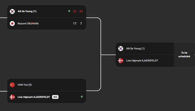 8강부턴 한웨, 천위페이, 왕즈이(세계 2위) 등 중국의 에이스 3명을 연달아 만날 것으로 보였다. 일단 한웨가 기권하면서 안세영은 조금 숨을 돌리면서 카예르스펠트와 싸울 수 있게 됐다.