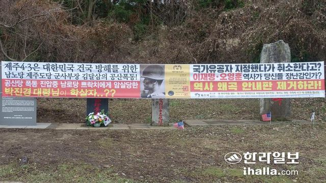 해당 현수막은 제주 4·3을 공산 폭동으로 규정하는 한편, 4·3당시 도민 수천명을 무차별적으로 체포한 故 박진경 대령의 과거 행적을 정부 공식 보고서를 토대로 기술한 '바로 세운 진실' 안내판 바로 앞에 설치돼 4·3의 진실을 가리고 역사를 를 왜곡한다는 비판을 받아왔다.