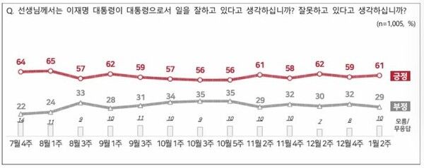 2주 전 조사(12월 넷째 주)에 비해 이 대통령 국정수행 긍정 응답률은 2%포인트 상승(59%→61%), 부정 응답률은 3%포인트 하락(32%→29%)했다.