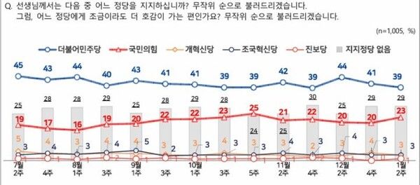 뉴시스 보도에 따르면, 엠브레인퍼블릭·케이스탯리서치·코리아리서치·한국리서치가 지난 5~7일(1월2주차) 사흘간 만 18세 이상 남녀 1005명을 대상으로 진행한 NBS(전국지표조사)에서 정당 지지도는 민주당 39%, 국민의힘 23%로 집계됐다.