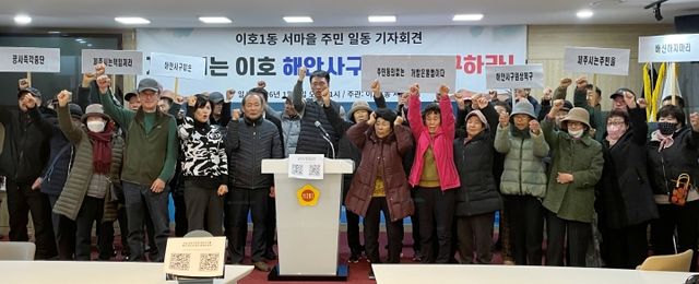 이호일동 서마을 주민들은 8일 기자회견을 열고 “마을의 유산 해안사구를 즉각 원상 복구하라”고 요구했다. 양유리기자
