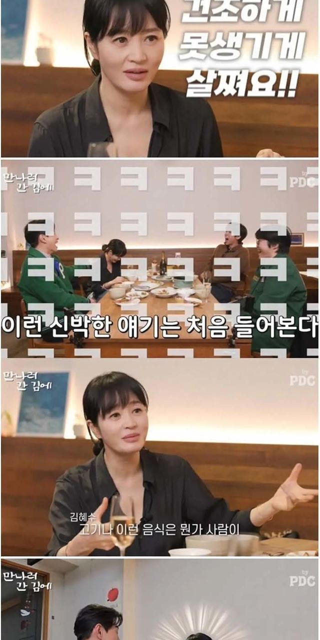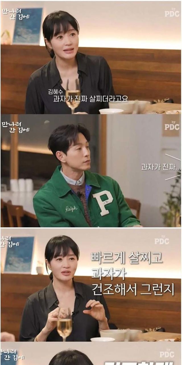 김혜수는 "과자는 살을 빠르게 찌게 한다. 과자가 건조해서 그런지 건조하고 못생기게 살찐다"고 말했다. 그러면서 "고기나 그런 음식을 먹으면 윤택하게 살이 찐다"며 음식에 따라 살이 찌는 방식이 다르다고 주장했다.
