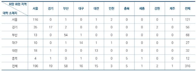 특히 한국 체류 계획을 밝힌 유학생 316명 중 서울에서 취업하고 싶다는 응답이 62.0%(196명)에 달했다. 서울에 이어 △부산 18.4%(58명) △경기 6.0%(919명) △대구 5.1%(16명) 순이다. 나머지 시·도는 5.0% 미만으로 집계됐다. 국내 체류 계획을 밝힌 유학생 10명 중 6명 이상은 ‘서울행’을 희망한 것이다.